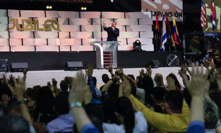 Pastor Wellington Junior ministrando a Palavra no Jubileu de Ouro da igreja na Colômbia